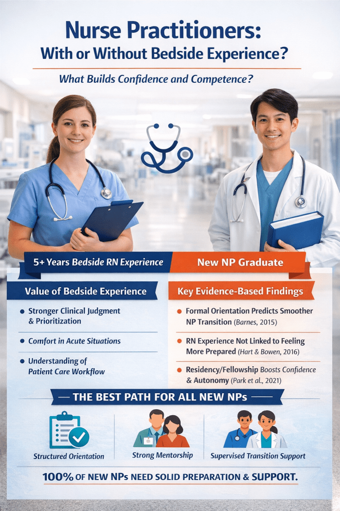 This is where I believe the profession needs to be more honest. We sometimes argue too much about who has “enough” experience and not enough about whether we are truly preparing and supporting new nurse practitioners. A new NP with years of bedside experience may still struggle if orientation is weak. On the other hand, a new NP without extensive floor experience may still grow into a strong clinician if the education is solid and the transition-to-practice support is strong.